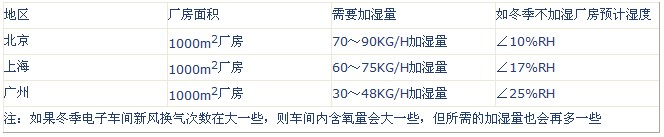 对于绝大多数电子厂家来说,如果厂房的空气含水量偏低,就要进行适当的加湿的。因为如果过于干燥,厂房内就会容易产生静电,造成厂房内cmos集成电路被损坏(相对湿度为20%RH时,厂房内静电电压为10000V,相对湿度低到10%时,厂房内极易产生20000V的电压),另外还会造成空气中的粉尘飞扬,容易诱发呼吸道等疾病,影响车间工人的身体健康降低工作效率。因此,必须对厂房内的空气湿度进行严格的控制。 尤其是冬天,天气普遍干燥。假设电子厂房内新风换气次数为2次/小时,一下地区的电子厂房的加湿量分别为: