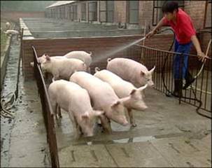 (2)间接降温:但生产上直接降温的范围很小,一是购买降温设施需要一定的投资,另外直接降温需要全封闭猪舍,而且需要密封良好,否则效果会大打折扣;更多的原因是猪舍设计结构不适宜直接降温,因为现在除大型猪场外,多数养猪场仍是开放式猪舍为主,而且结构简陋。为此在不能解决猪舍降温时,可以考虑局部降温,也就是使猪感到凉爽但空气温度不一定降低。正常情况下,猪体散热方式有四种,辐射、对流、传导、蒸发,在猪降温上面利用较好的只有对流与蒸发两种;对流的方式是通风,风速可使猪感到凉爽,减少热应激;猪与人不同,汗腺不发达,通过出汗后蒸发散热效果很差,蒸发散热只能借助水的作用。